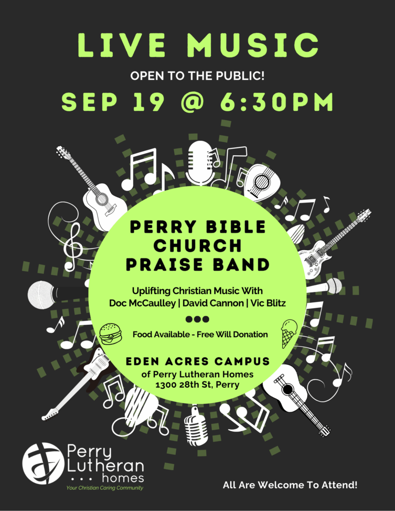 Perry Lutheran Homes invites the public to a special indoor community concert featuring the Perry Bible Church Praise Band, with members Randy “Doc” McCaulley, David Cannon, and Vic Blitz—delivering an inspiring blend of uplifting Christian music.