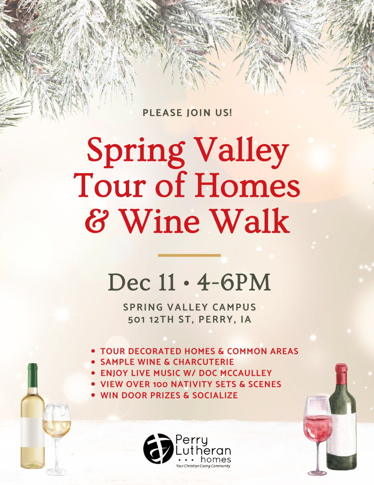 Celebrate the joy of the Christmas season at the Spring Valley Christmas Tour of Homes & Wine Walk on Thursday, December 11, from 4:00 – 6:00 PM, hosted at Spring Valley Retirement Community, a Perry Lutheran Homes community.